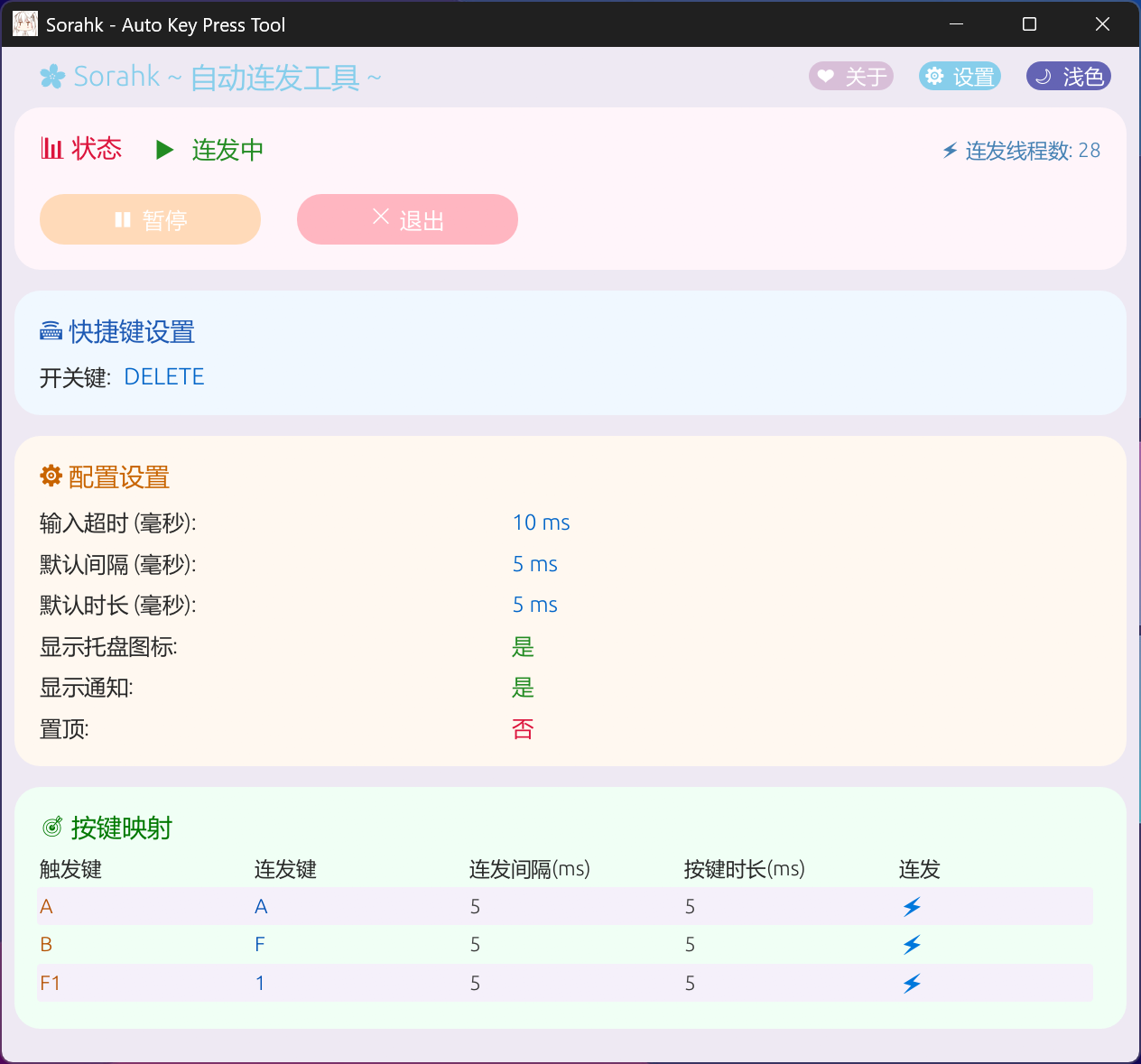 Sorahk 是一款由 Rust 编写的 Windows 按键工具,提供可配置的按键映射与连发功能并具有图形界面。其使用 windows crate 与 egui 构建,具有高性能,高稳定性, 低延迟,低资源消耗等特性,支持系统托盘与通知功能。